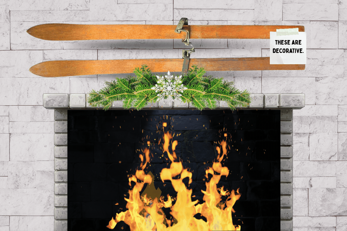 Once again, a ski chalet is reminding guests that the aged wooden skis hanging above the fireplace are for mere decoration and not intended for actual use.